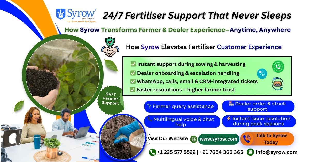 Partner with Syrow for Smarter Fertiliser Customer Support. As the economy drives on agriculture these days, apart from product quality, customer experience also plays an important role. Syrow’s 24*7 omnichannel customer support for fertilizers empowers brands with the ability to deliver timely, accurate, and consistent support across every channel. By marrying AI efficiency with frontline human expertise, Syrow enables fertiliser companies to build stronger relationships, increase farmer satisfaction, and achieve more sustainable growth.