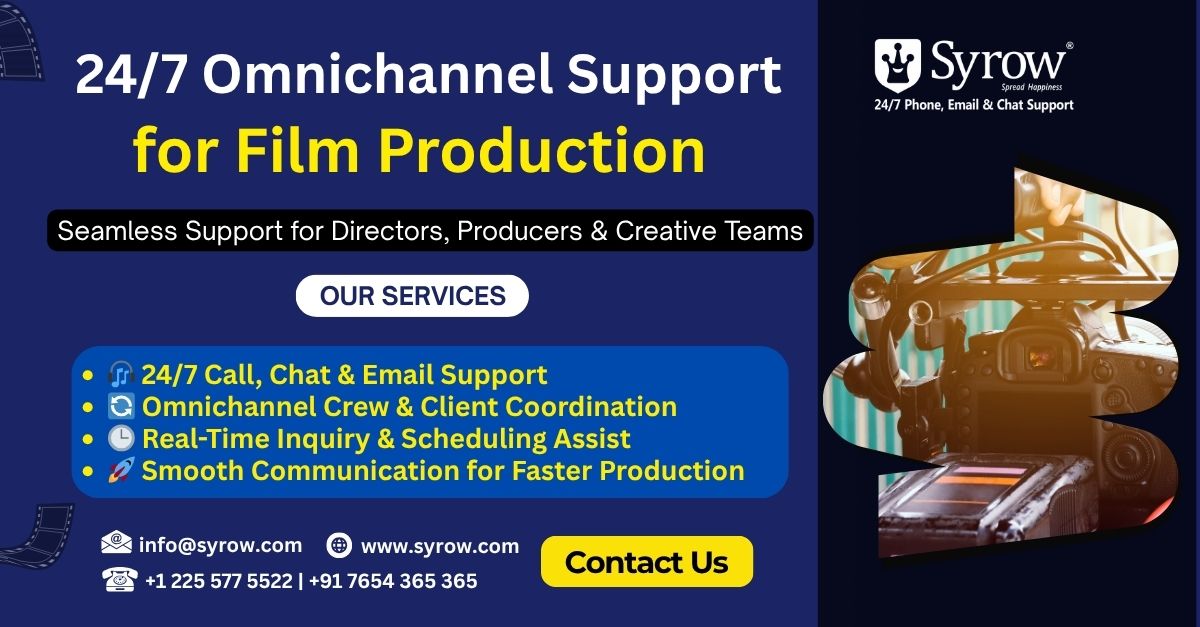 24/7 Omnichannel Support for Film Production | Syrow film production support | Film studio customer support services | AI + Human support for filmmakers | 24/7 customer service for film industry | Omnichannel CX for film teams | Syrow customer support for film projects | Film production helpline | Outsourced support for film companies | Film industry customer experience solutions | Syrow’s 24/7 Omnichannel Support for Film Production | Film Production support | 24/7 customer support for film production |