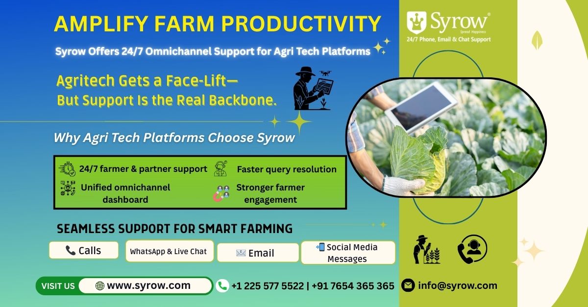 AgriTech innovations in agriculture are at the core of growth, but more importantly, how deeply farmers trust and use these digital tools will make a difference. That trust is built through consistent, 24/7, omnichannel support, and Syrow is leading the way with world-class service quality, multilingual capabilities, AI + human expertise, and zero-downtime operations. Syrow omnichannel customer support for Agri Tech platforms ensures farmers get the help they need, when they need it-boosting adoption, improving productivity, and accelerating Agri Tech growth.