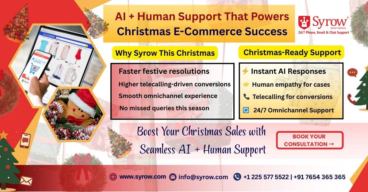 AI chatbot for e-commerce | Human-assisted customer support | Telecalling services for e-commerce | Christmas sales customer engagement | E-commerce festive offer support | Peak season customer support solutions | 24/7 customer support for online retail | AI + human hybrid customer service | How Syrow handles high-volume Christmas queries |