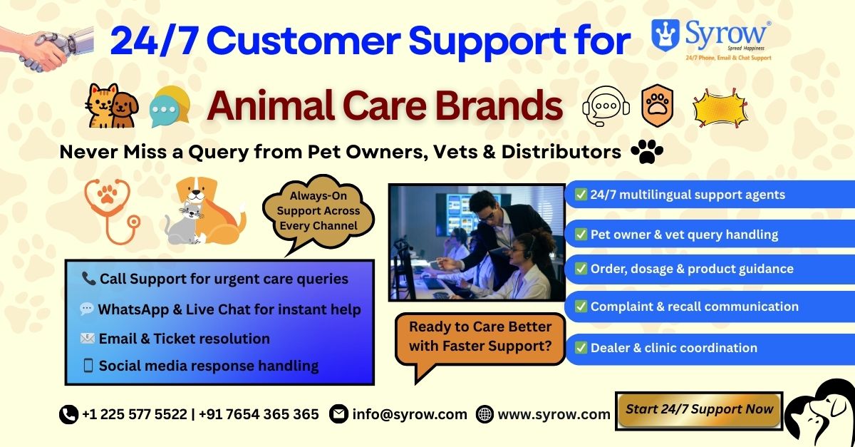 At Syrow’s, 24/7 animal care customer support is night emergency queries are responded.