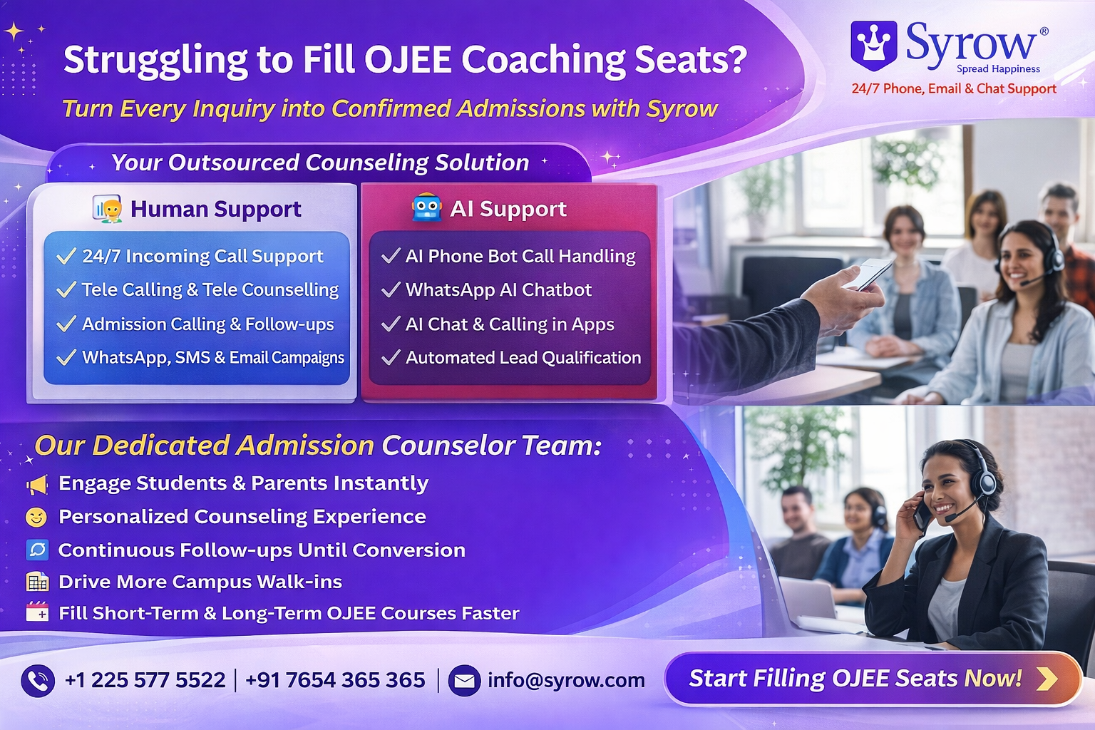 In this context, Syrow AI & Human Support is considered to be the best outsourcing customer support service for OJEE coaching centers, which helps them increase walk-ins and maximize their admissions for both short-term and long-term OJEE courses.