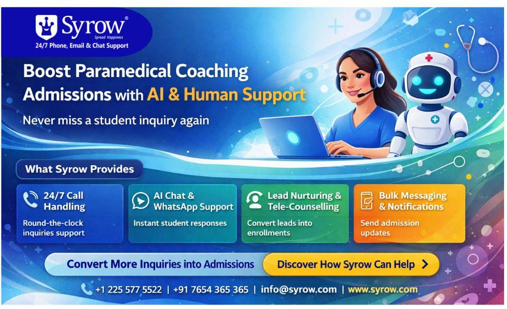 This is where Syrow AI & Human Support makes a huge difference. As the leading outsourcing customer support solutions company, Syrow uses the combined power of human tele-counsellors and AI technology to assist educational institutions in converting more leads into admissions for state-level paramedical entrance coaching programs.