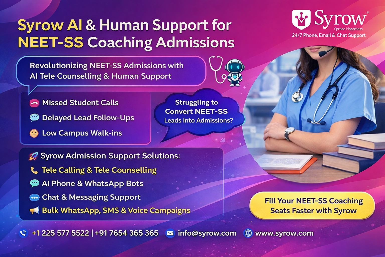 is your coaching institute ready to transform its NEET-SS admissions with Syrow’s AI and Human Support?
