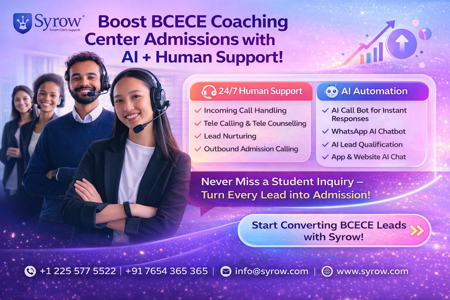In today’s highly competitive education market, filling seats in coaching institutes, especially for highly competitive entrance exams like BCECE, is not an easy task. With thousands of students exploring different opportunities, coaching institutes must act fast, communicate well, and win trust instantly. This is where Syrow’s AI & Human Support for BCECE Coaching Center Admissions can be a real game-changer.