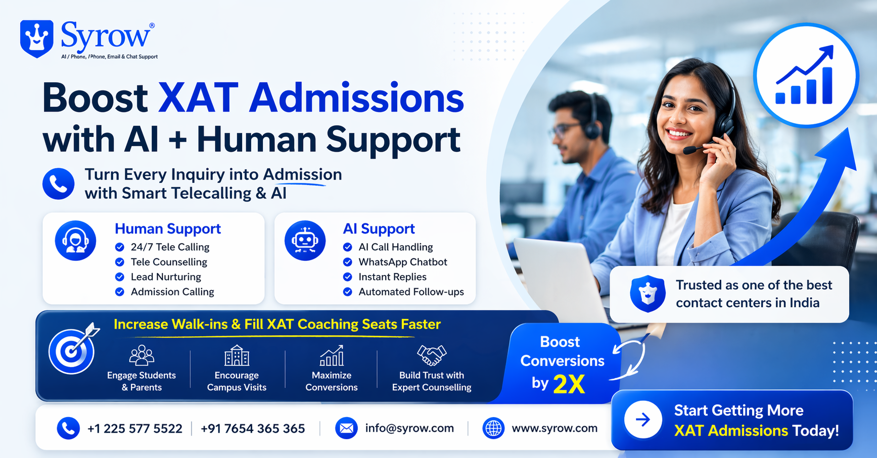 It is here that Syrowโs AI & Human outsourcing customer support plays its part and becomes the best solution for educational institutions that require assistance with filling their classrooms with XAT prep course participants.