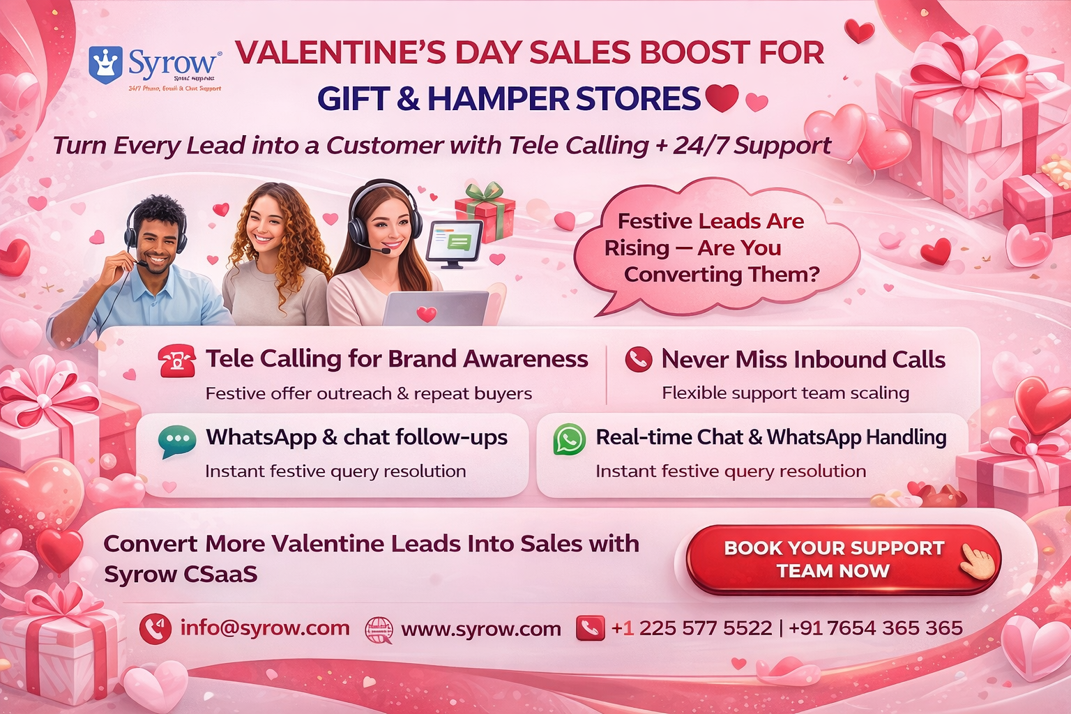 Valentine’s Day is considered to be one of the highest sales seasons for the gift and hamper stores industry. However, customers are actively looking for the perfect gifts or are placing last-minute orders for the festival season. Also, customers are looking for immediate replies to all kinds of queries they might have for the stores. For this reason, gift and hamper stores need the assistance of the best outsourcing customer service provider, Syrow, to ensure successful customer interactions during this peak season for sales.