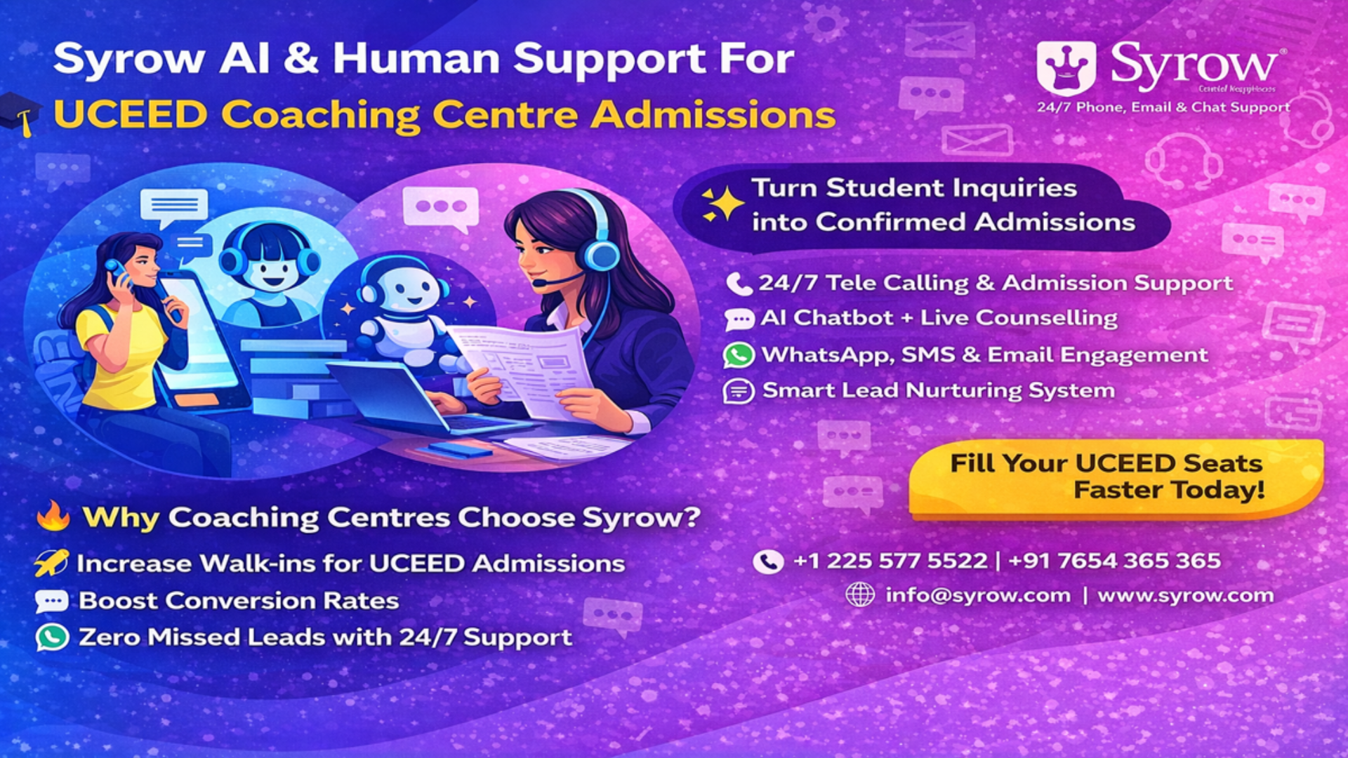 🚀 Syrow AI & Human Support for Undergraduate Common Entrance Examination for Design (UCEED) Coaching Centre Admissions 🎯 Leveraging AI…