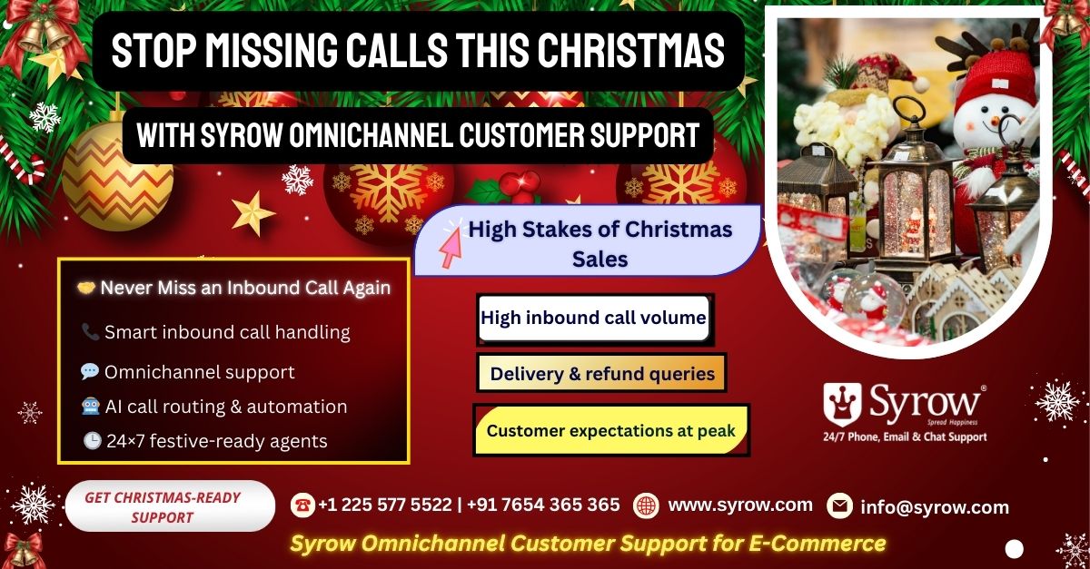 Syrow Omnichannel Customer Support | Christmas e-commerce customer support | festive sales customer service | avoid missed calls Christmas sales | e-commerce inbound call management | 24/7 customer support for e-commerce | Syrow customer support services | omnichannel support for online sellers | e-commerce Christmas rush management | holiday season customer support | scalable customer support for e-commerce | AI-powered customer support Syrow | multilingual customer support for e-commerce | flexible BPO services for Christmas sales| Syrow omnichannel customer support for e-commerce |