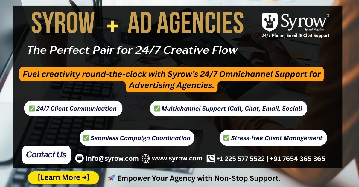The Partnership That Powers Creativity In the fast-paced advertising world, ideas flow 24/7, and support should likewise be available. Syrow’s 24/7 Omnichannel Support for Advertising Agencies makes sure your creative flow is never stopped, bridges time zones, amplifies client communication, and gives space for what really matters: creativity.