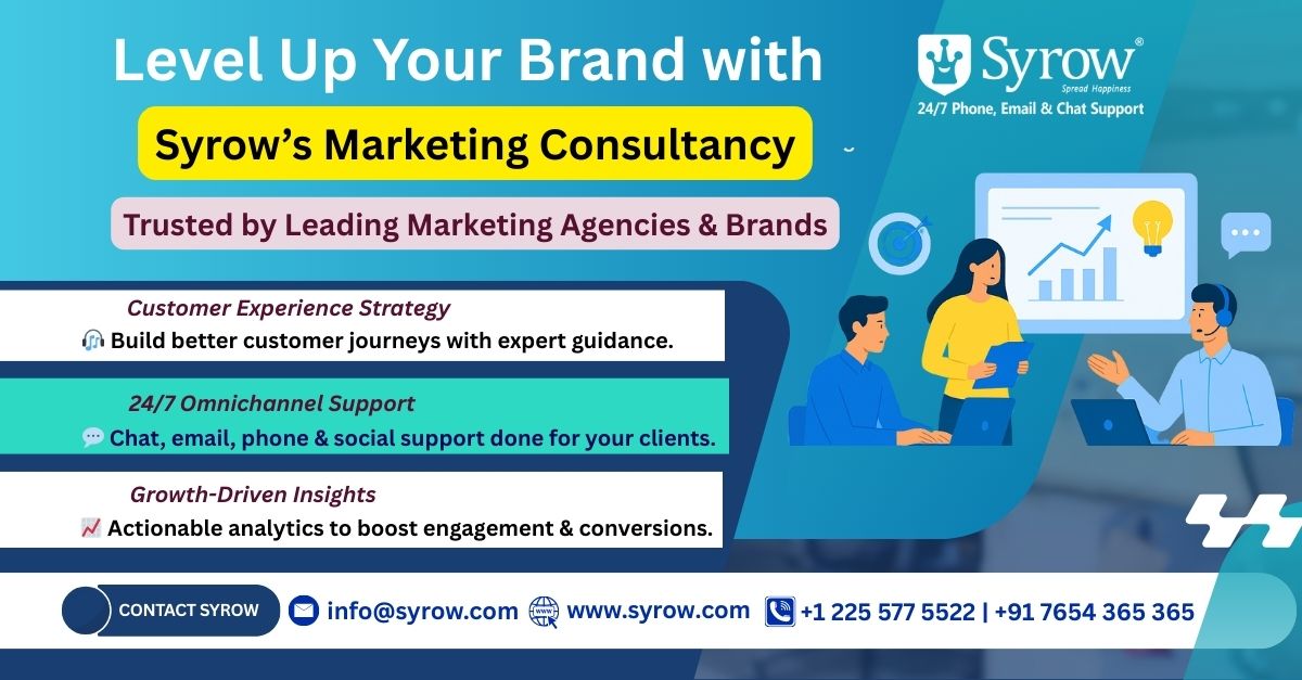 A Smarter Way for Agencies to Grow What agencies need today is much more than mere support: agility, speed, consistency, and smart tools to make communication easy. Syrow’s 24/7 Omnichannel Customer Support for Marketing Consultancy fulfills all of the aforementioned and even more, making it an ideal outsourcing partner for agencies seeking to transform customer experiences, scale up operations, and gain prominence in the highly competitive marketplace.