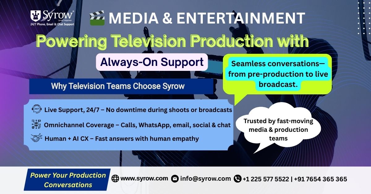 Syrow Makes Television Production Faster, Smoother & More Reliable Television production is a high-pressure environment where even a single delay can lead to financial losses, missed deadlines, and operational chaos. With Syrow’s 24/7 customer support and powerful omnichannel support for television production, production houses gain the speed, clarity, and reliability needed to keep operations running without interruption. Syrow doesn’t just support production; it becomes the invisible engine that powers it—day and night.